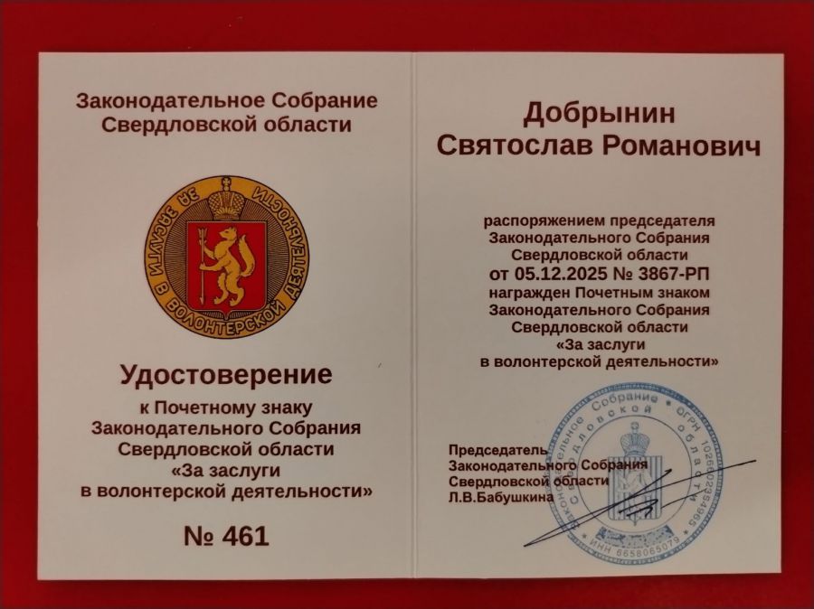 Почетным знаком волонтера Законодательного Собрания Свердловской области награжден Святослав Добрынин, юный активист Свердловской региональной общественной организации русской культуры и развития дружбы народов «Моё Отечество», участник множества межнациональных, гражданско-патриотических и казачьих мероприятий, проводимых на Среднем Урале.