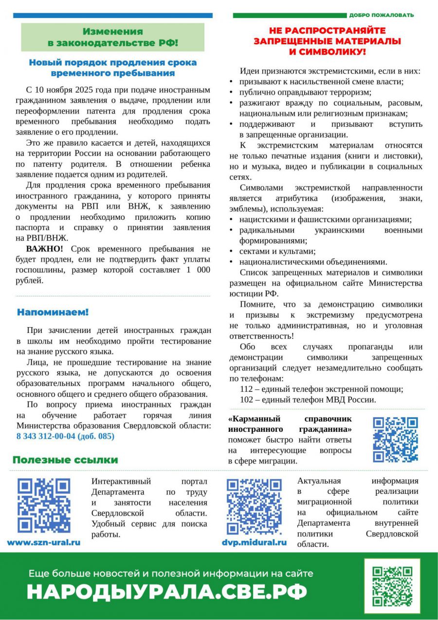 Иностранные граждане, легально находящиеся на территории Российской Федерации, получают поддержку в процессе социальной и культурной интеграции. Департамент внутренней политики Свердловской области регулярно выпускает ежемесячный информационный бюллетень, содержащий сведения о значимых событиях, праздничных датах и обновлениях миграционного законодательства.