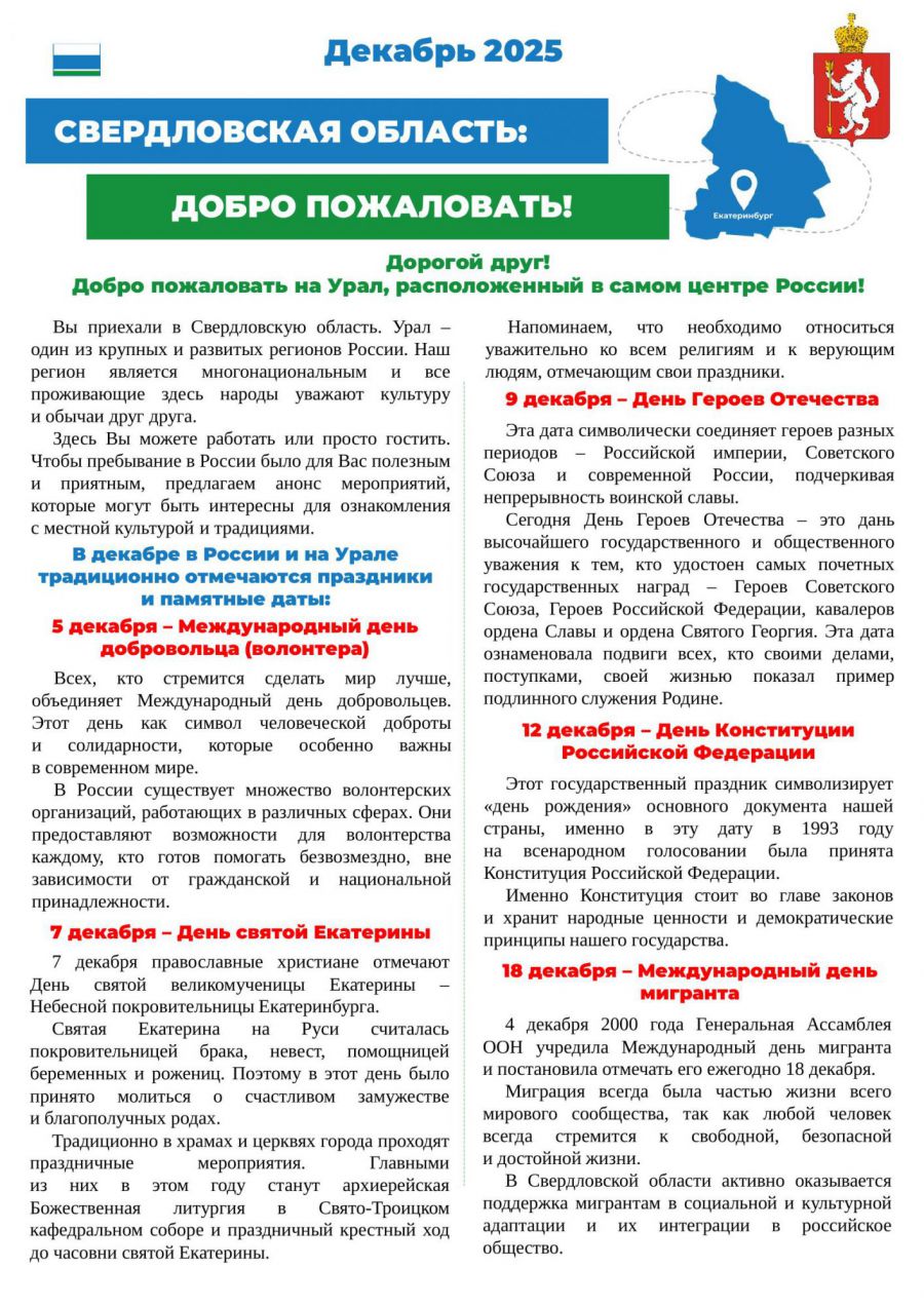 Особое внимание уделяется декабрю, завершающему календарному месяцу, насыщенному значимыми мероприятиями. По всей России и на Урале проходят праздники, памятные даты, события, отражающие героическое прошлое страны и способствующие укреплению традиционных духовно-нравственных ценностей. Активное участие в этих мероприятиях позволяет иностранцам глубже погрузиться в российскую культуру, историю и традиции.