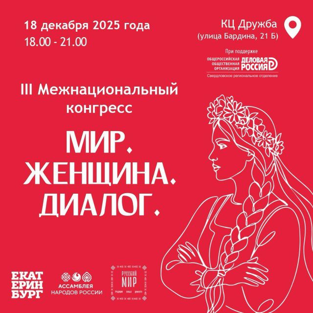III Межнациональный конгресс «Мир. Женщина. Диалог.» состоится в Екатеринбурге 18 декабря. Проект конгресса СРОО «Русский МИР» победил в конкурсе на предоставление субсидий из городского бюджета для реализации социально значимых инициатив в 2025 году.