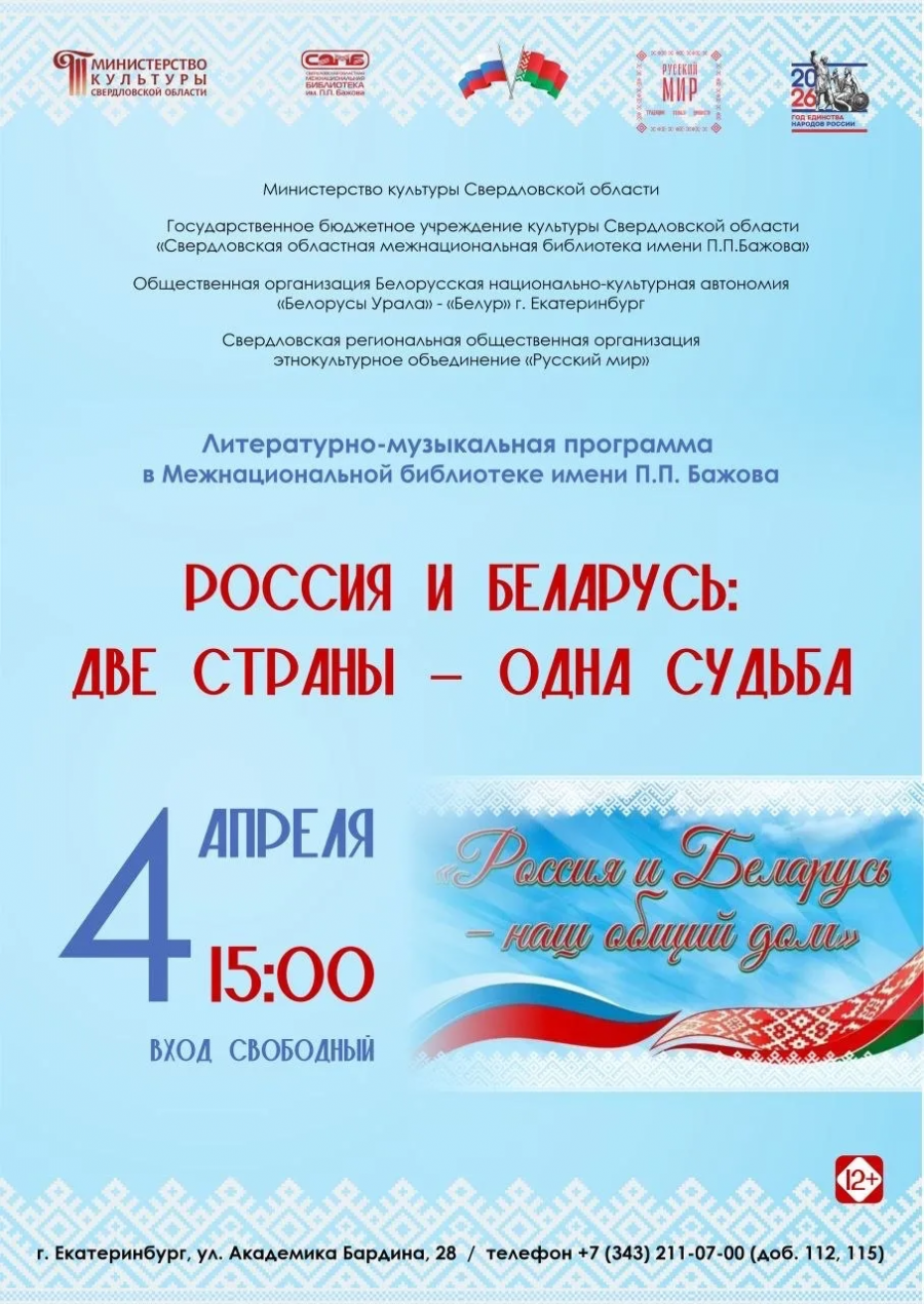 4 апреля в 15.00 состоится праздничный вечер, который Свердловская областная межнациональная библиотека имени П.П. Бажова уже несколько лет проводит вместе с партнерами – Белорусской национально-культурной автономией «Белорусы Урала» («Белур») и Свердловской региональной общественной организацией этнокультурное объединение «Русский мир».